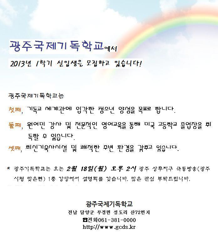 저희 광주국제기독학교에서는 2013학년도 신입생을 모집하고 있습니다.